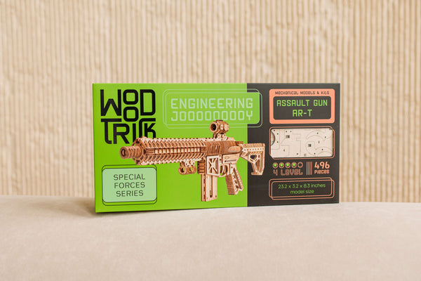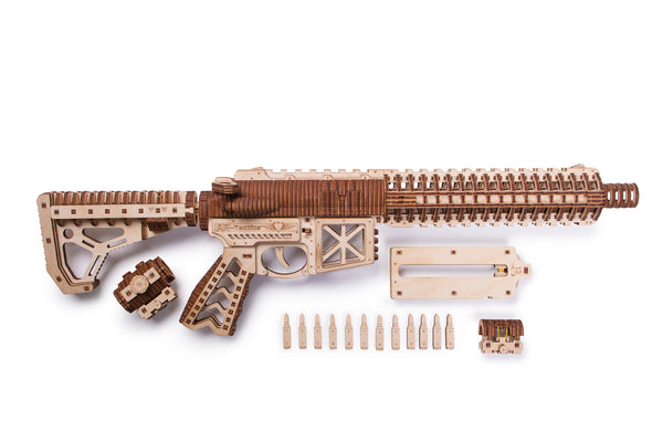 Het Assault Gun AR-T bouwpakket is een indrukwekkend model voor de liefhebber van moderne vuurwapens. Dit houten geweer heeft een verstelbare kolf, een houder voor een laserpointer en kan houten kogels tot wel 8 meter ver schieten.